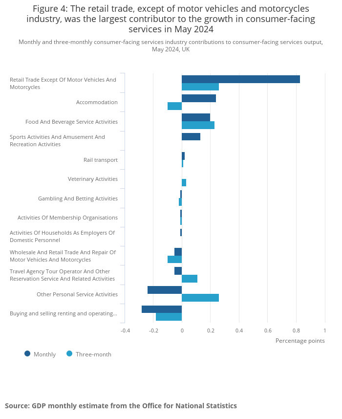 Services output grew by 0.3% in May 2024, following growth of 0.3% in April 2024 (revised up from 0.2% growth in our last publication), and was the largest contributor to monthly GDP growth in May 2024.