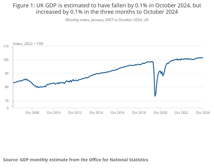 Monthly real gross domestic product (GDP) is estimated to have fallen by 0.1% in October 2024. This follows a fall of 0.1% in September 2024 and growth of 0.2% in August 2024.