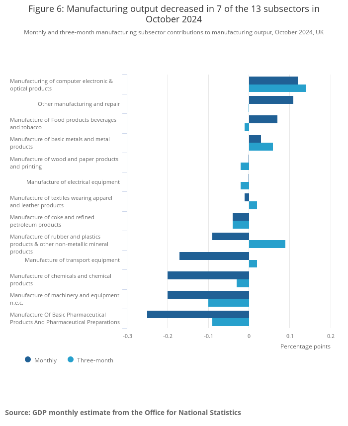 Manufacturing output fell by 0.6% in October. It was the largest contributor to the reduction in production output in the month, following a fall of 1.0% in September 2024. Manufacturing output decreased in 7 of the 13 subsectors in October 2024. The largest negative contributions in October 2024 came from: