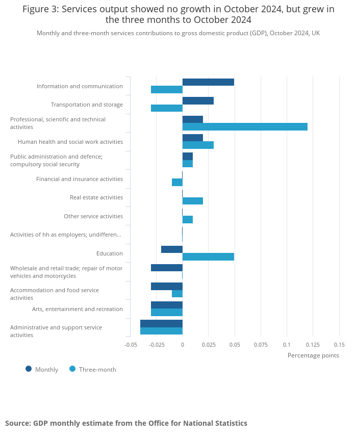Monthly services output showed no growth in October 2024 after also showing no growth in September 2024, but grew by 0.1% in the three months to October 2024.