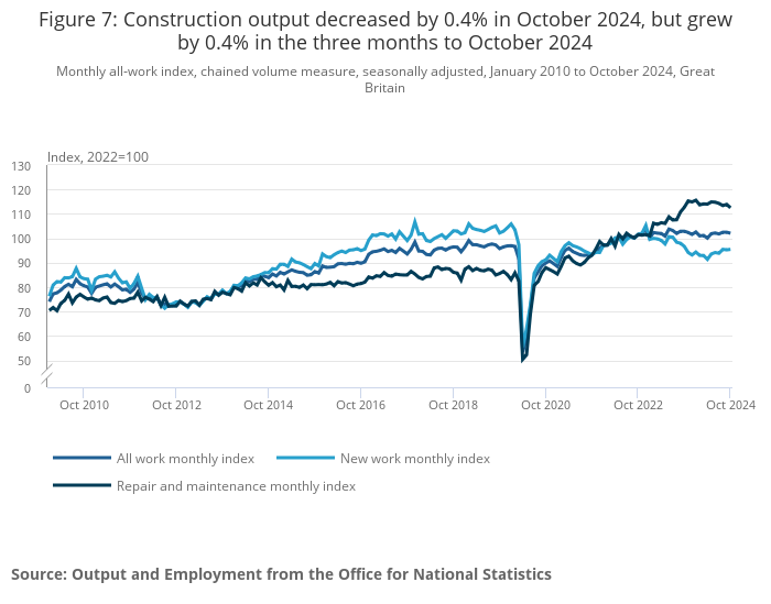 Monthly construction output is estimated to have fallen by 0.4% in October 2024, following an increase of 0.1% in September 2024. The fall in monthly output in October 2024 came solely from repair and maintenance, which fell by 1.3%. New work grew by 0.2%.