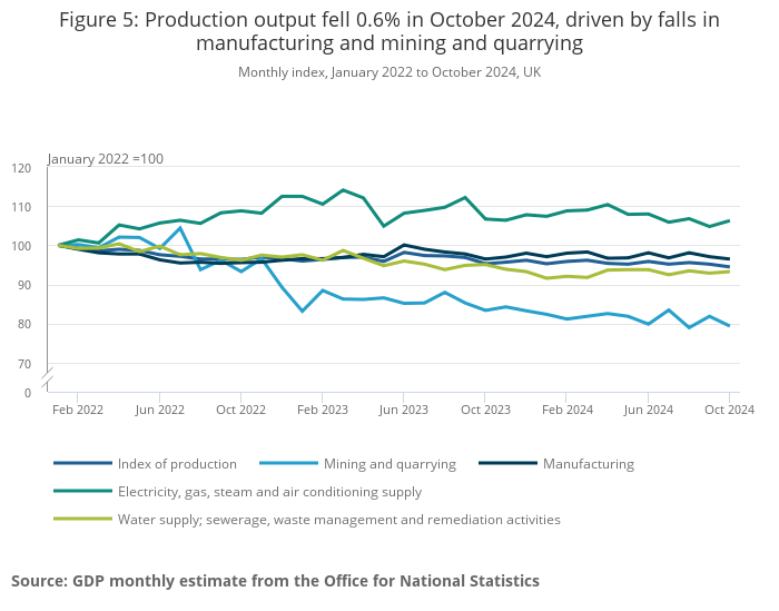 Production output fell by 0.6% in October 2024, because of falls in manufacturing, and mining and quarrying output, following a fall of 0.5% in September 2024; production output fell by 0.3% in the three months to October 2024.