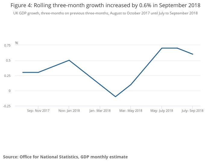 Image .csv .xlsRolling three-month growth was 0.6% in September 2018 (Figure 4), in line with the stronger growths seen in both July and August. The effects of the warmer-than-usual weather seen in the summer months continued to impact on economic growth in the most recent quarter.