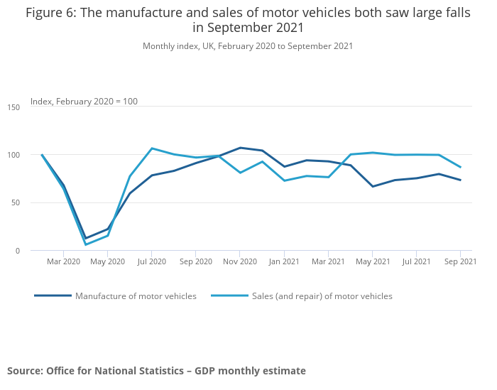 Figure 6: The manufacture and sales of motor vehicles both saw large falls in September 2021