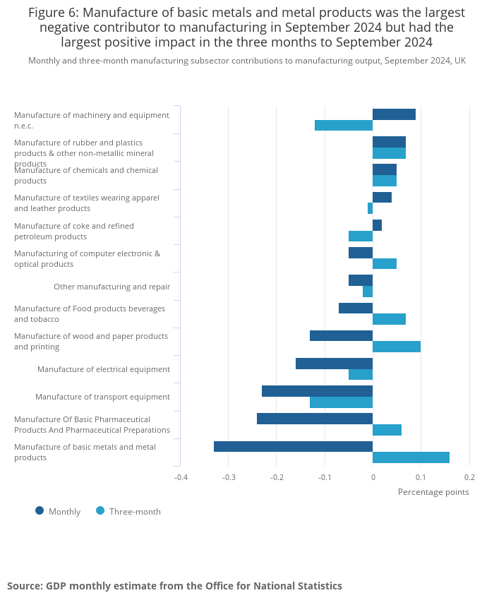 Figure 6: Manufacture of basic metals and metal products was the largest negative contributor to manufacturing in September 2024 but had the largest positive impact in the three months to September 2024