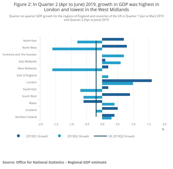The North West, West Midlands and East of England had negative growth in Quarter 2 2019 when compared with the same quarter a year earlier, at negative 0.7%, negative 0.6% and negative 0.1% respectively.