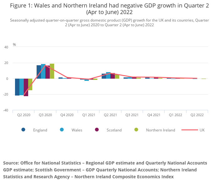 In Quarter 2 (Apr to June) 2022, Wales and Northern Ireland showed negative quarter-on-quarter growth in gross domestic product (GDP) of 0.4% and 0.3% respectively, while growth in England and Scotland was flat at 0.0%.