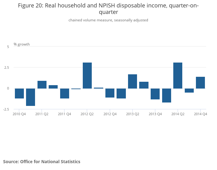 UK GDP in volume terms was estimated to have increased by 0.6% between Quarter 3 (July to Sept) 2014 and Quarter 4 (Oct to Dec) 2014, revised up 0.1 percentage points from the previous estimate of GDP published 26 February 2015