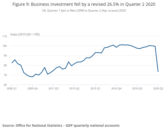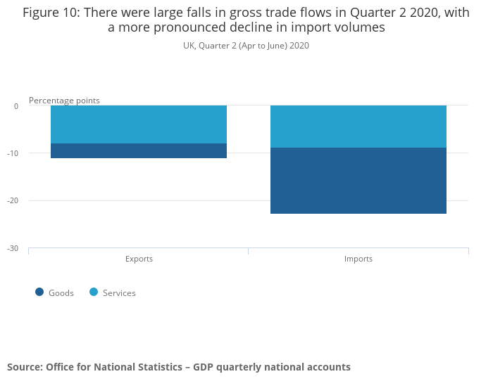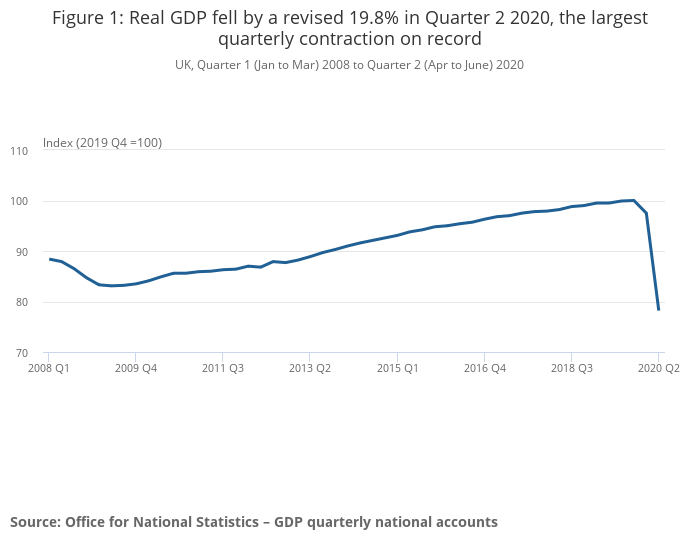 UK gross domestic product (GDP) is estimated to have contracted by 19.8% in Quarter 2 (Apr to June) 2020, revised from the initial estimate of a 20.4% fall.