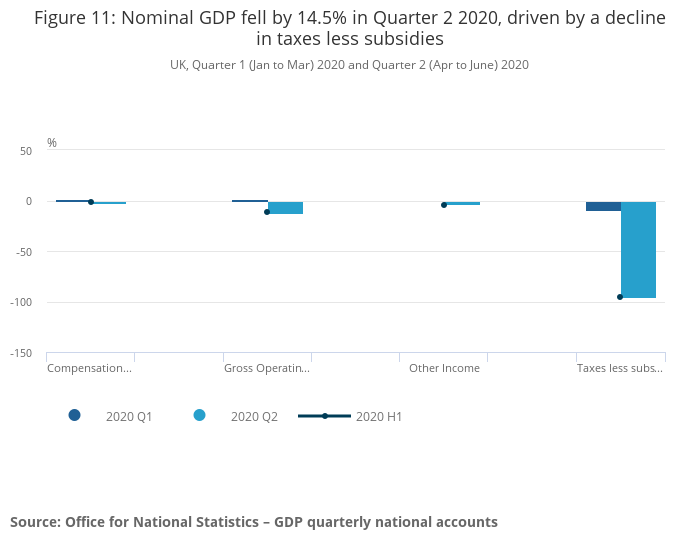 Nominal GDP fell by a revised 14.5% in Quarter 2 2020, its largest quarterly contraction on record. The implied GDP deflator represents the broadest measure of inflation in the economy, reflecting changes in the price of all goods and services that comprise GDP, and increased by 6.7% in the second quarter. This primarily reflects movements in the implied price change of government consumption, which increased by 35.3% in Quarter 2 2020. This reflects how we record elements of non-market output, specifically health and education.