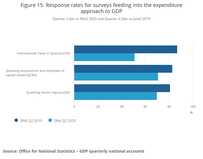 Image .csv .xlsFigure 14, Figure 15 and Figure 16 highlight a decline in response rates for surveys that feed into the GDP quarterly national accounts and Quarterly sector accounts estimates for Quarter 2 (Apr to June) 2020. We have undertaken a significant amount of work to ensure that the effect on the quality of our estimates are mitigated as much as possible.