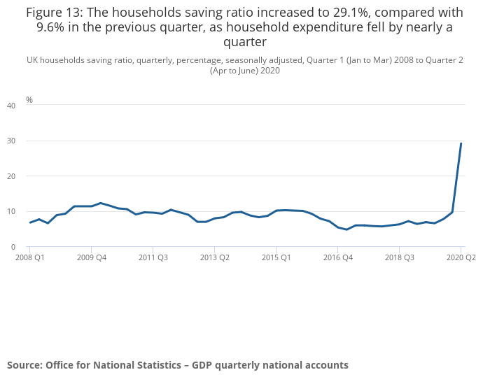 The households saving ratio increased to a record 29.1% in Quarter 2 2020, compared with 9.6% in Quarter 1 (Jan to Mar) 2020.