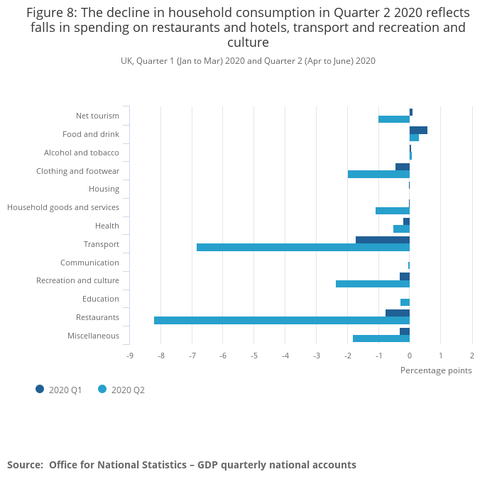 Image .csv .xlsFigure 13 shows that the households saving ratio increased to a record 29.1% in the latest quarter, compared with 9.6% in the previous quarter, as households reduced their consumption spending by a record £80.5 billion (negative 24.2%). This is over nine times greater than the previous largest quarterly fall in household spending of this type. The reduction in spending is driven by large falls in expenditure on restaurants and hotels, transport – particularly air transport and motor vehicles – and recreation and cultural services.