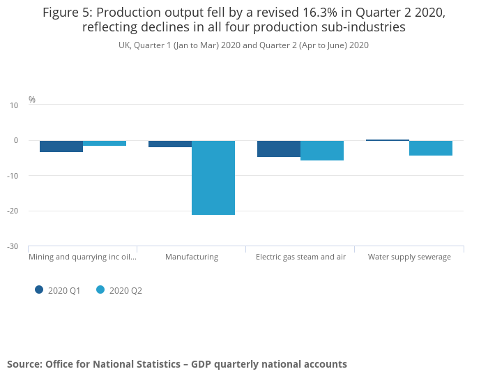 Figure 5: Production output fell by a revised 16.3% in Quarter 2 2020, reflecting declines in all four production sub-industries
