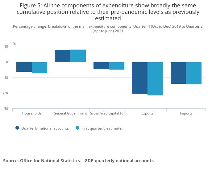 In Quarter 2 (Apr to June) 2021, there were increases in all the main components of expenditure, with the largest contribution from the 7.2% quarterly increase in household consumption. These increases are following the easing of coronavirus (COVID-19) restrictions in Quarter 2 2021 compared with those in place in Quarter 1 (Jan to Mar) 2021. Following revisions to their first estimates, all of the main components of expenditure show broadly the same cumulative position relative to their pre-pandemic levels (Figure 5).