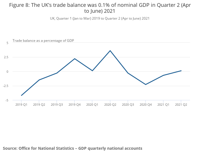 The UK’s net borrowing position with the rest of the world reduced to 1.5% of GDP in Quarter 2 (Apr to Jun) of 2021 compared with 1.7% of GDP in Quarter 1 (Jan to Mar) of 2021.