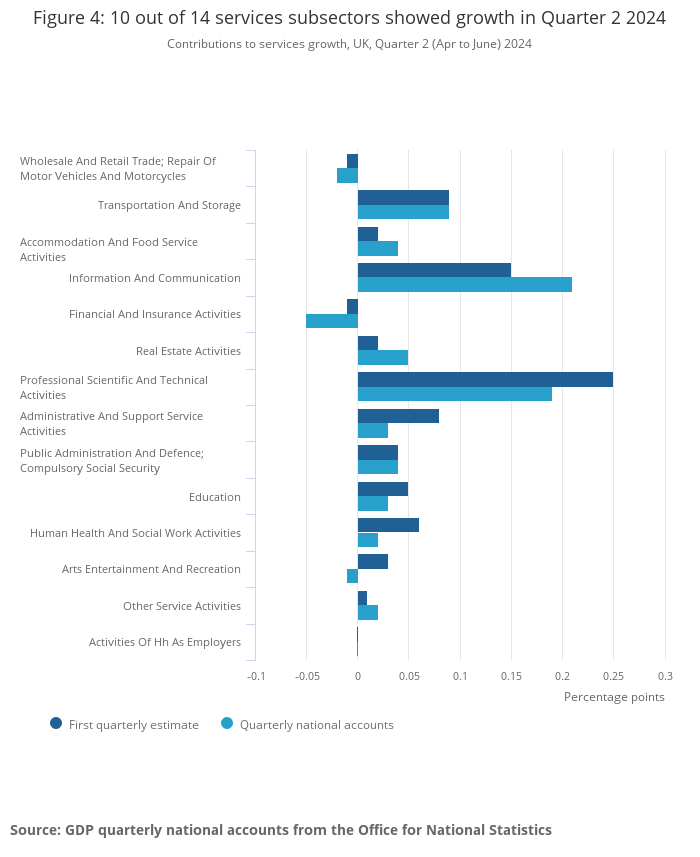 The growth in the latest quarter was driven by a 0.6% increase in services output while production and construction fell on the quarter. Across Quarter 2, early estimates suggest 13 out of 20 of the services, production and construction subsectors grew, down from 14 the previous quarter.