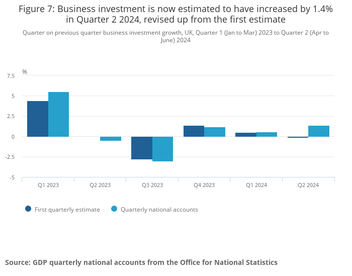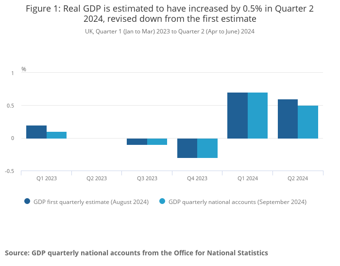 UK gross domestic product (GDP) is estimated to have grown by 0.5% in Quarter 2 (Apr to June) 2024, revised down from a first estimate increase of 0.6%.