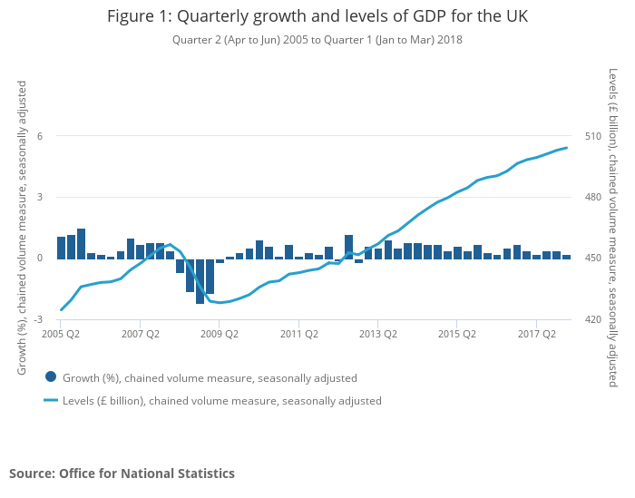 UK gross domestic product (GDP) in volume terms was estimated to have increased by 0.2% between Quarter 4 (Oct to Dec) 2017 and Quarter 1 (Jan to Mar) 2018; the 0.1 percentage points upward revision since the second estimate reflects improvements to the measurement of construction output.