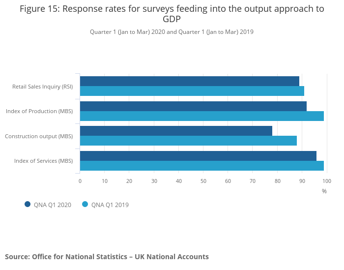 This release captures the first direct effects of the coronavirus pandemic and the government measures taken to reduce transmission of the virus. Because of the disruption to business and implementation of these government measures, which include restrictions in movement, we faced an increased number of challenges in producing the Quarter 1 (Jan to Mar) 2020 GDP estimate for the UK. These challenges include lower than usual response to surveys that feed into this estimate. For more information on response rates, please see the Quality and methodology section of this release.