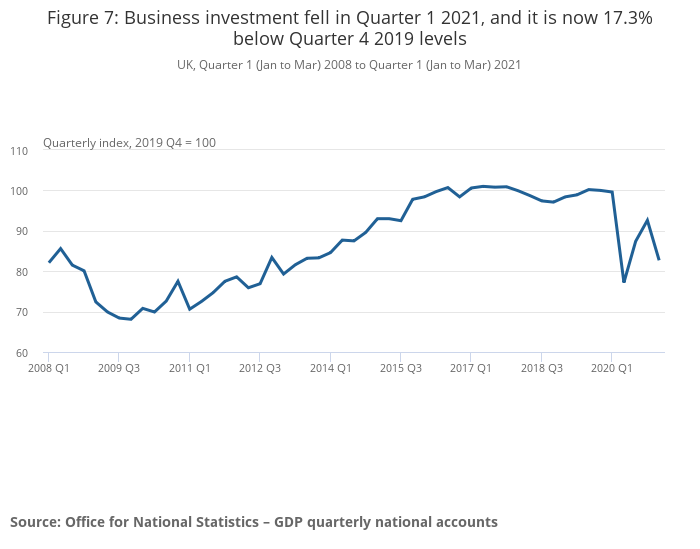Figure 7: Business investment fell in Quarter 1 2021, and it is now 17.3% below Quarter 4 2019 levels