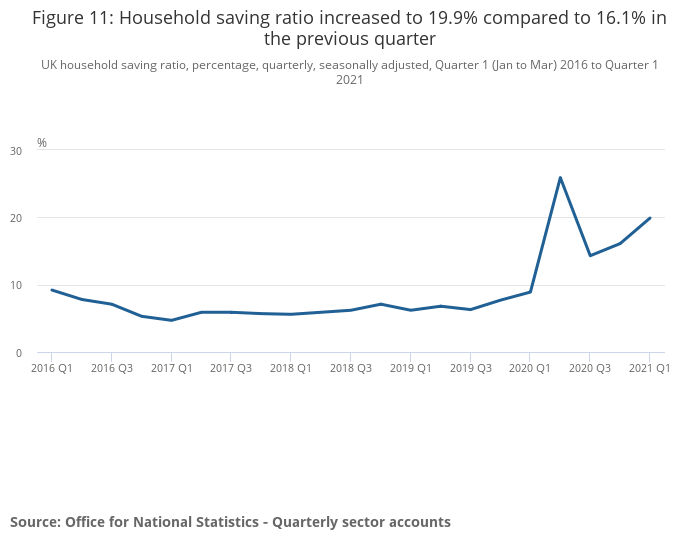 The household saving ratio increased to 19.9% in Quarter 1 2021, which is the second highest on record, compared with 16.1% in Quarter 4 2020.