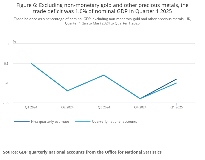 The International Passenger Survey (IPS), which is the source of travel services estimates (accounting for approximately 8% of total trade), is being transformed as part of our Improving our travel and tourism statistics project, and travel services estimates have been forecast since Quarter 1 2024. In our September 2025 quarterly national accounts release, we will update Quarters 1 and 2 2024 to be based on survey data. For later periods, estimates will be forecast during the period of the Travel and tourism transformation.