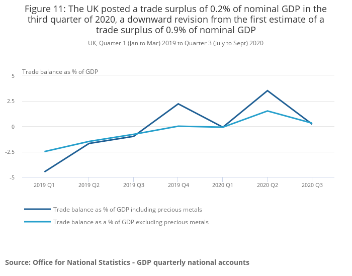 The UK’s lending position with the rest of the world has increased by £4.7 billion to 3.1% of GDP in Quarter 3 2020, a return to a level closer to pre-pandemic normality. This was driven by a rise in trade in goods and services of £15.3 billion. For further information see the Balance of payments bulletin.