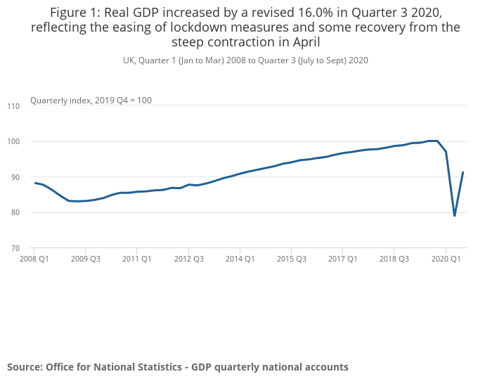 UK gross domestic product (GDP) is estimated to have increased by a record 16.0% in Quarter 3 (July to Sept) 2020, revised from the first estimate of 15.5% growth.