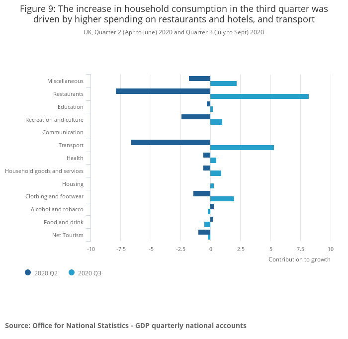 Households’ final consumption expenditure increased by £50.7 billion in Quarter 3 2020, which can largely be attributed to an increase in expenditure on restaurants and hotels, and transport. Transport saw increases as households increased their expenditure on motor sales and fuel. For more details on changes in consumer spending and its drivers see Consumer trends.