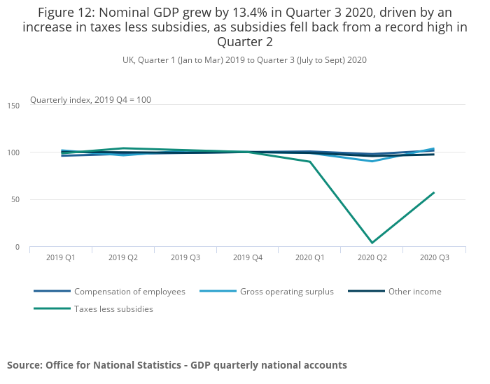 In the income approach to measuring GDP, there has been a notable upward revision to the taxes less subsidies component as a result of a downward revision to subsidies because of updated estimates to the Coronavirus Job Retention Scheme.
