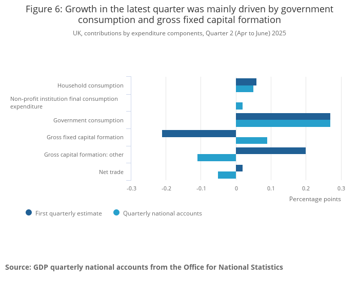 - UK gross domestic product (GDP) is estimated to have grown by an unrevised 0.3% in Quarter 2 (Apr to June) 2025, following an unrevised increase of 0.7% in Quarter 1 (Jan to Mar).