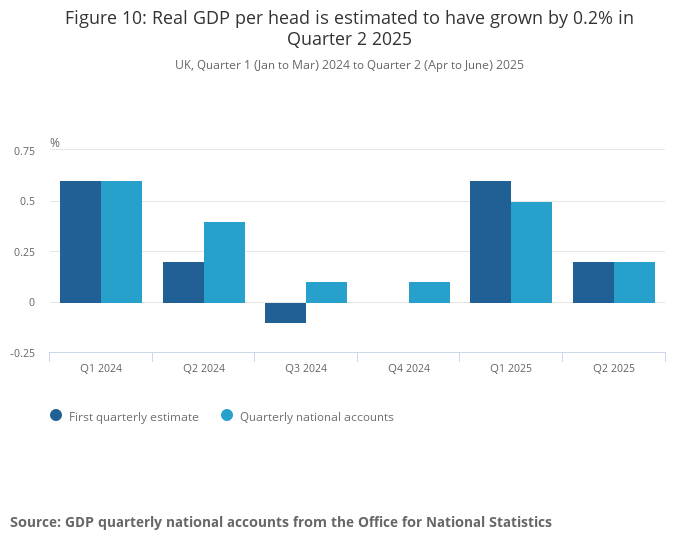 Image .csv .xlsReal GDP per head is estimated to have grown by an unrevised 0.2% in Quarter 2 2025 and is up by 0.9% compared with the same quarter a year ago. Consistent with the National Accounts Revisions Policy, there have been revisions to GDP and population figures as part of this release. See Section 6: Real GDP and real disposable income per head for more information.