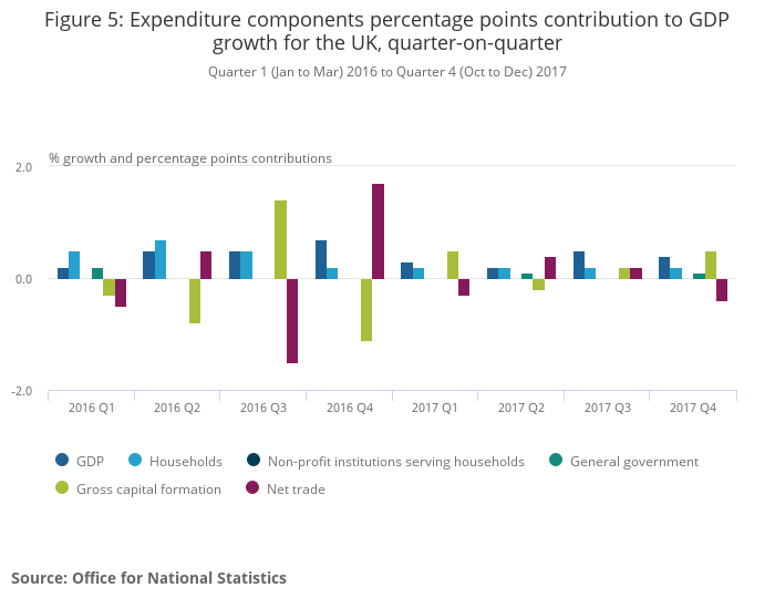 UK gross domestic product (GDP) increased by 0.4% between Quarter 3 (July to Sept) 2017 and Quarter 4 (Oct to Dec) 2017.