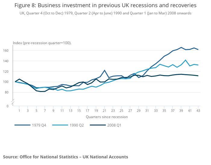 Figure 8: Business investment in previous UK recessions and recoveries