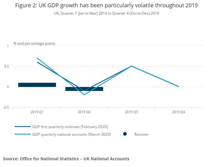 There were 0.1 percentage point revisions to GDP growth, upwards in Quarter 1 (Jan to Mar) 2019 and downwards in Quarter 2 (Apr to June) 2019, as a result of updated source data.