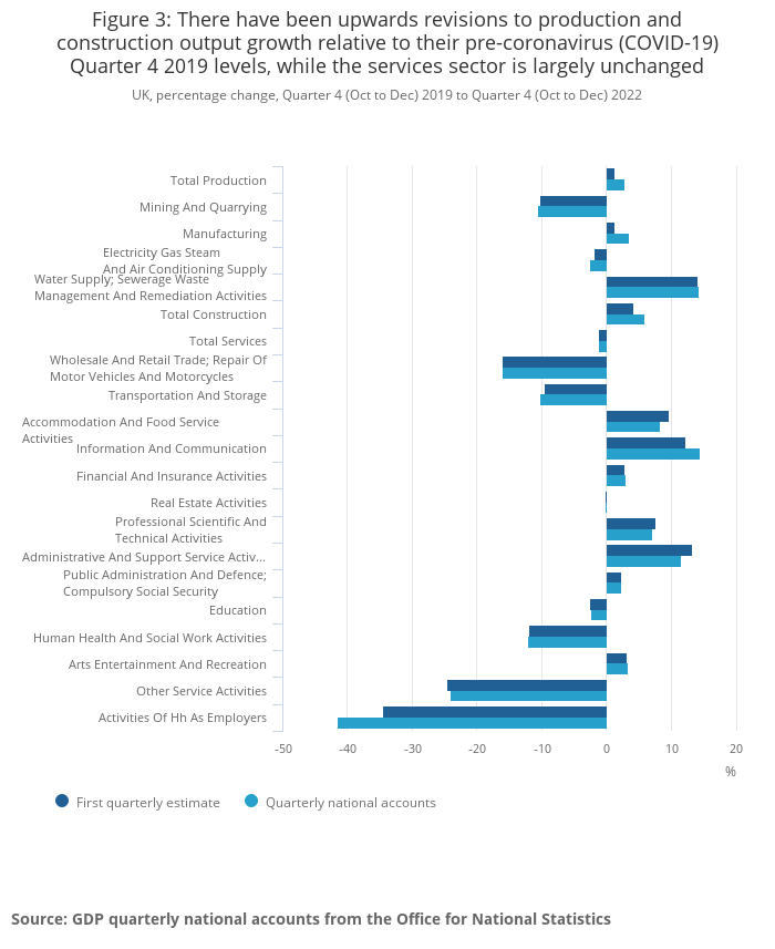 In Quarter 4 (Oct to Dec) 2022, output is now estimated to have increased by 0.1% (revised from flat growth). Services have been revised up to a 0.1% increase, following a first estimate of no growth. Output in the production sector was broadly flat, revised up from a fall of 0.2% in the first estimate. Construction output increased by 1.3% in Quarter 4 2022, following a first estimate of 0.3% growth.