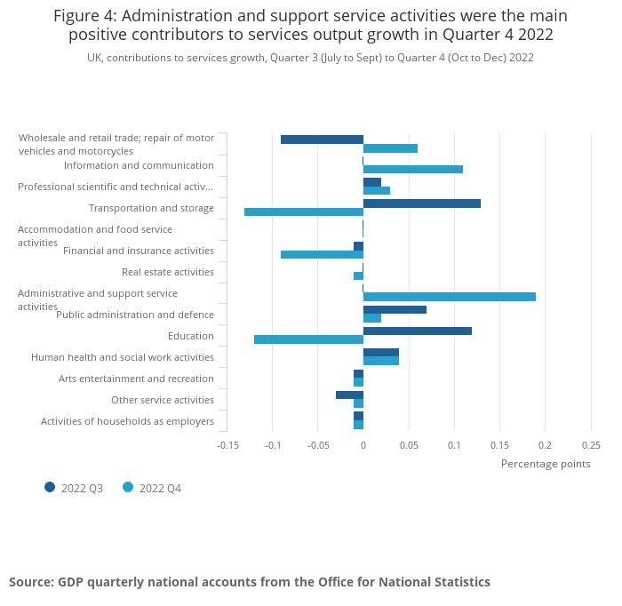 The largest positive contribution to growth in Quarter 4 2022 was from administrative and support service activities, particularly travel agents, which increased by 10.8% in Quarter 4 2022 following a fall in the previous quarter. However, this was partially largely offset by declines in education (1.5%) and transportation and storage output (2.9%). For further information on the fall in education please see Section 4: Expenditure.