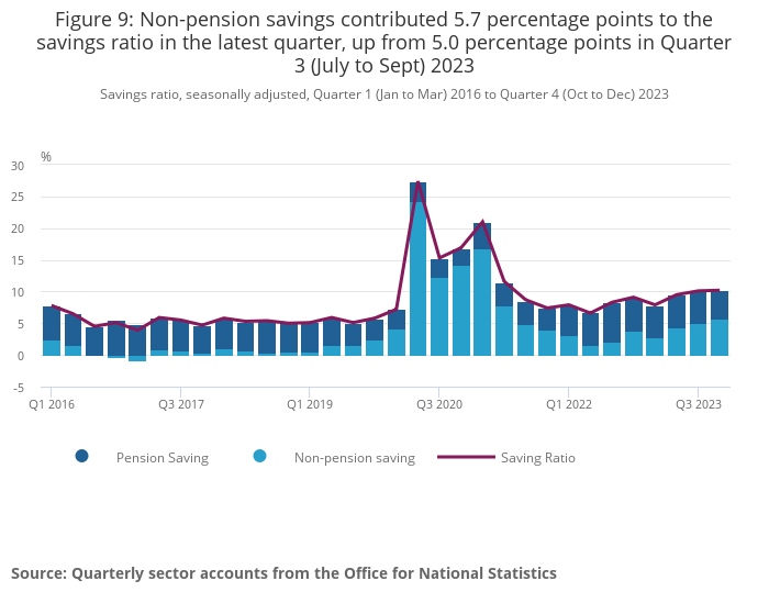 Figure 9: Non-pension savings contributed 5.7 percentage points to the savings ratio in the latest quarter, up from 5.0 percentage points in Quarter 3 (July to Sept) 2023