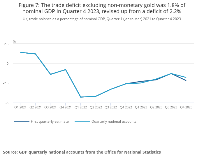 The UK's borrowing position with the rest of the world as a percentage of gross domestic product (GDP) is estimated to have increased to 3.3% in Quarter 4 2023 compared with 2.9% of GDP in Quarter 3 2023.