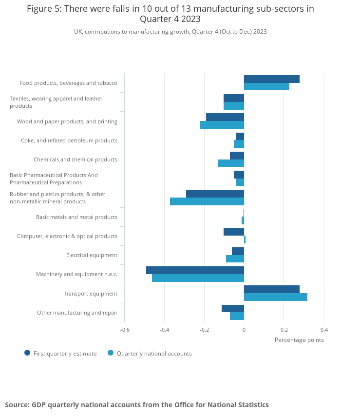 Manufacturing output is estimated to have fallen by 1.0% in Quarter 4 2023, with 10 of the 13 manufacturing subsectors declining, and this was the largest contributor to the fall in production over this period. This follows four consecutive quarters of manufacturing growth.