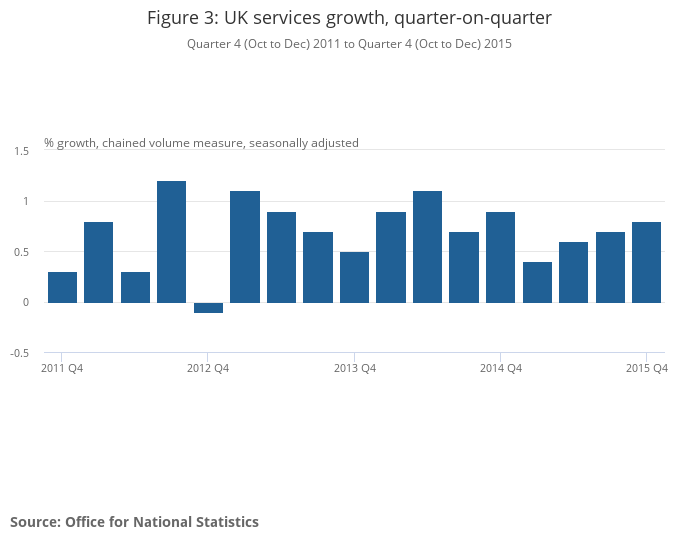 The service industries increased by 0.8% in Quarter 4 2015 (Figure 3), revised up 0.1 percentage points from the previous estimate, marking the twelfth consecutive quarter of positive growth. This follows a 0.7% increase in Quarter 3 2015.