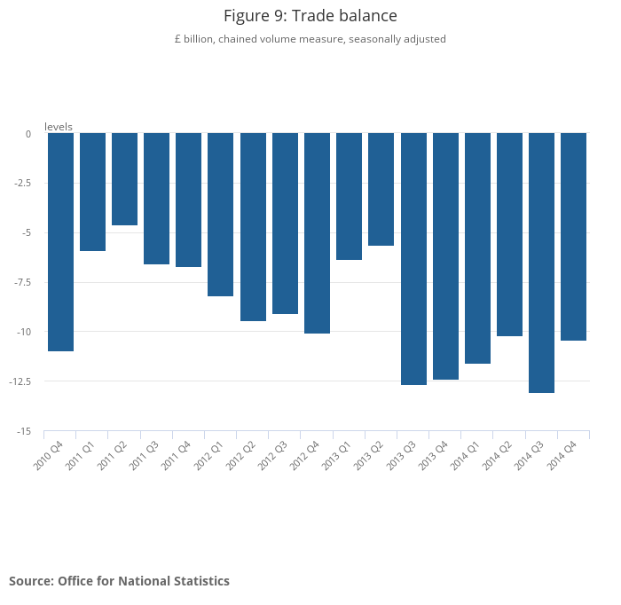 The trade balance deficit narrowed from £13.1 billion in Q3 2014 to £10.4 billion in Q4 2014 (see Figure 9). The trade position reflects exports minus imports. Following a 0.8% decrease in Q3 2014, exports rose by 3.5% in the latest quarter, while imports increased by 1.3% following a 1.4% increase in Q3 2014. Between 2013 and 2014, exports increased by 0.4% while imports increased by 1.8%.