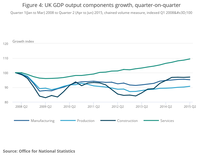 Production activity began to grow again in 2010, and the manufacturing and the construction industries showed particular strength, however neither industry sustained this growth. Production output fell in both 2011 and 2012, falling below levels seen at the depth of the downturn in 2009. Construction output also fell sharply in 2012, with output falling close to its 2009 trough after further contraction in Quarter 1 (Jan to Mar) 2013. Construction output improved over much of 2014. Although, there has been widespread growth across all major components of GDP since the start of 2013, the service industry remains the largest and steadiest contributor to overall economic growth, and is the only headline industry in which output has exceeded pre-downturn levels.