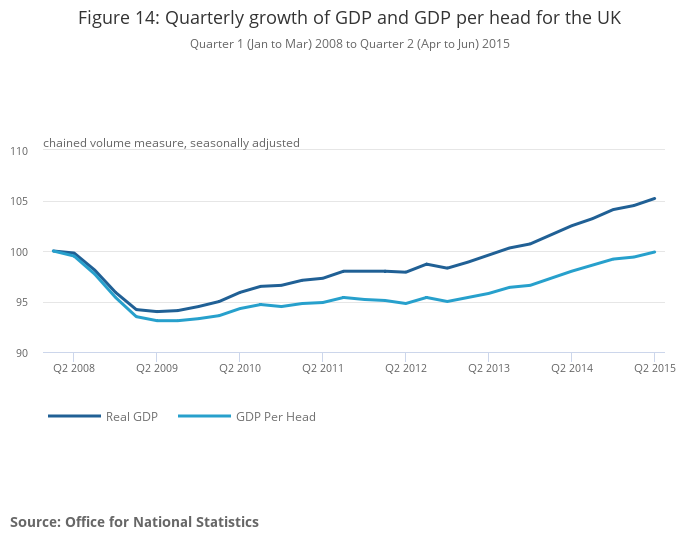 GDP per head in volume terms was estimated to have increased by 0.5% between Quarter 1 2015 and Quarter 2 2015. Between 2013 and 2014, GDP per head increased by 2.3%