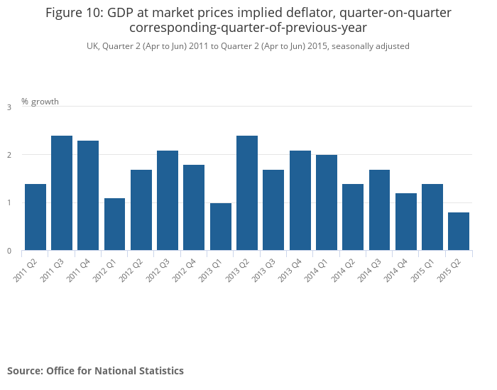 The GDP implied deflator at market prices for Quarter 2 (Apr to June) 2015 is 0.8% above the same quarter of 2014 (Figure 10). The GDP implied deflator is calculated by dividing current price (nominal) GDP by chained volume (real) GDP and multiplying by 100 to convert to an index. It is not used in the calculation of GDP; the deflators for expenditure components, which are the basis for the implied GDP deflator, are used to calculate nominal GDP, not real GDP.