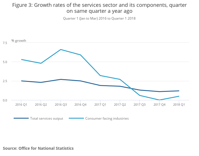 UK gross domestic product (GDP) in volume terms was estimated to have increased by 0.1% between Quarter 4 (Oct to Dec) 2017 and Quarter 1 (Jan to Mar) 2018, unrevised from the preliminary estimate of GDP.