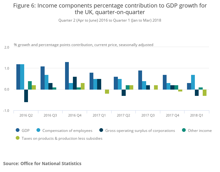 There was an increase in other income of 0.5% in Quarter 1 2018. Other income is comprised of mixed income (mostly self-employment income) and the operating surplus (profits) of the non-corporate sector. This slowed from a growth of 1.2% in the previous quarter, in part due to a reduction in the numbers of self-employed as reported in the UK labour market: May 2018 publication.