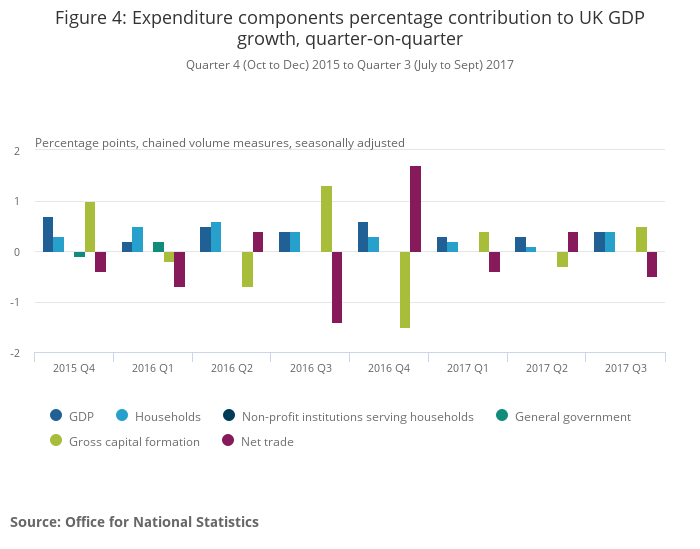 Figure 4 shows the quarterly contribution of the expenditure components to the growth of GDP in chained volume measures from Quarter 4 (Oct to Dec) 2015 to Quarter 3 2017. In the latest quarter the largest contribution to growth was from gross capital formation (GCF), at 0.5 percentage points. This was driven by acquisitions less disposals of valuables, in particular the trade in non-monetary gold. However, this was offset by the negative contribution from net trade of 0.5 percentage points, which also includes non-monetary gold, therefore making this transaction GDP neutral. You can find out more about the impact of non-monetary gold in the article A brief explanation of non-monetary gold in national accounts.