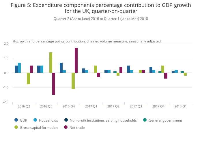 UK gross domestic product (GDP) in volume terms was estimated to have increased by 0.1% between Quarter 4 (Oct to Dec) 2017 and Quarter 1 (Jan to Mar) 2018, unrevised from the preliminary estimate of GDP.